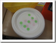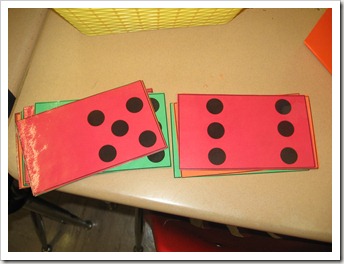 I made a set for 5-9. In the yellow basket are dot cards I made using paper plates and sticky dots. Regular dot cards are in the gift bag. I decided to make my own because I could create what my students needed to focus on.